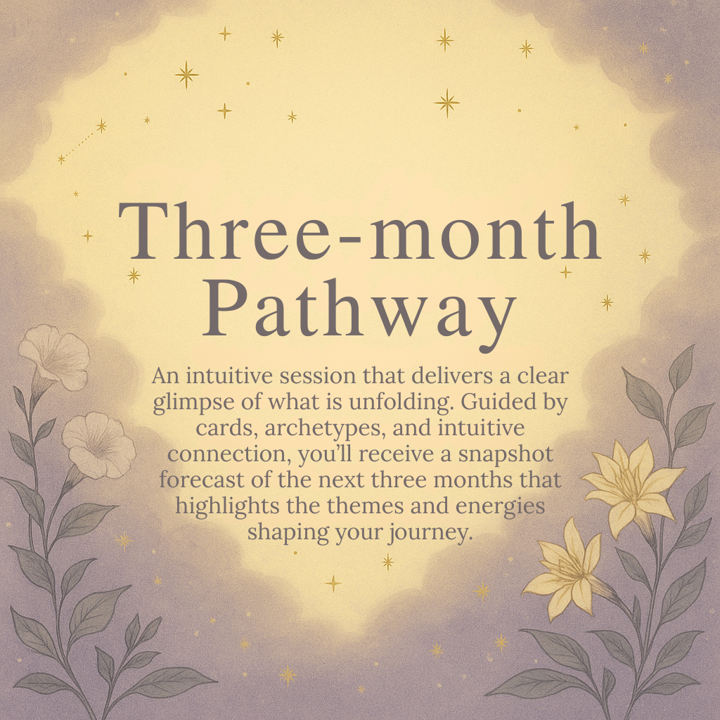 This session gives you a clear glimpse of what is unfolding. I will call on the cards, archetypes, and intuitive insight to receive a snapshot forecast of the next three months that highlights the themes and energies shaping your journey ahead.